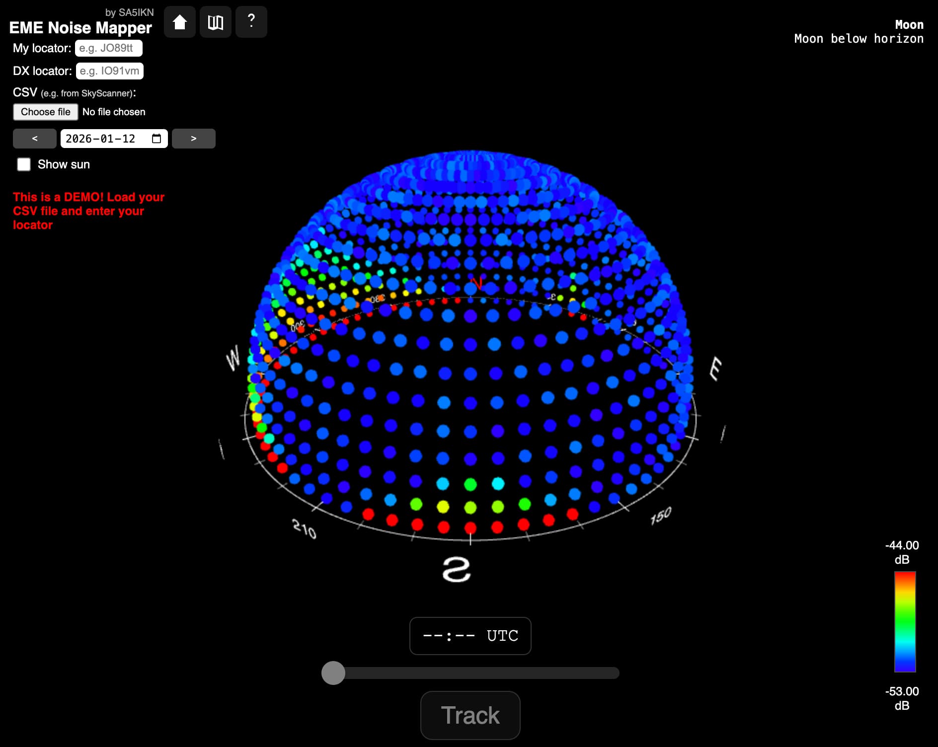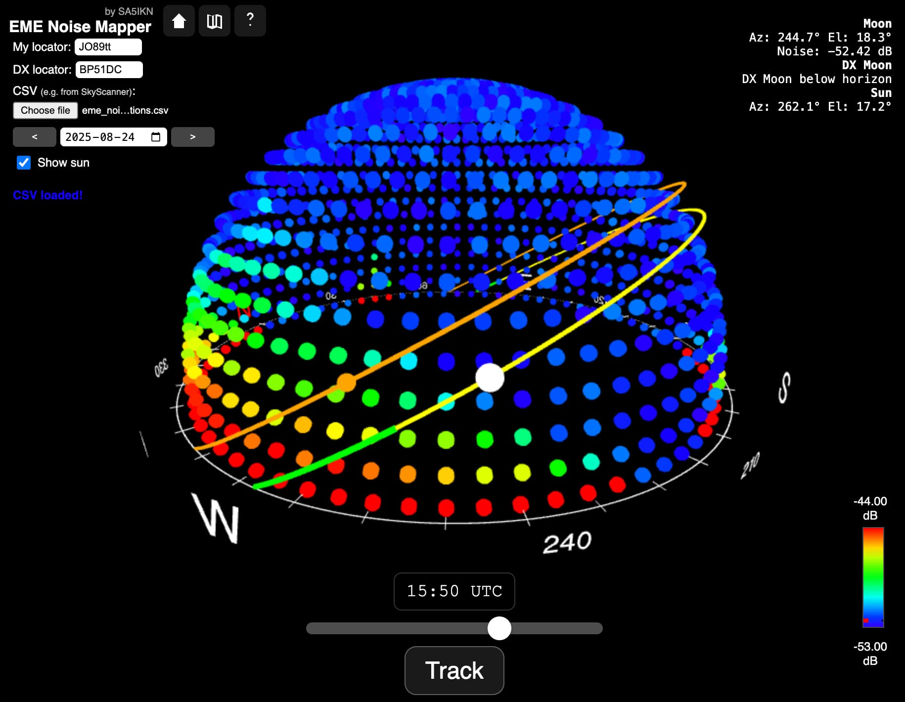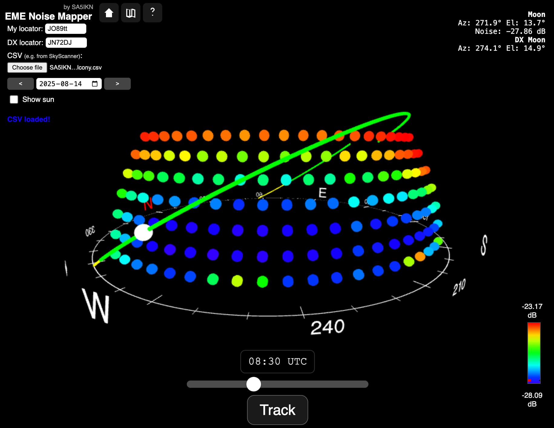 EME Noise Mapper includes a real-time tracking mode. Click the Track button to enable continuous updates of the Moon’s position and all associated metrics, including the interpolated noise level.