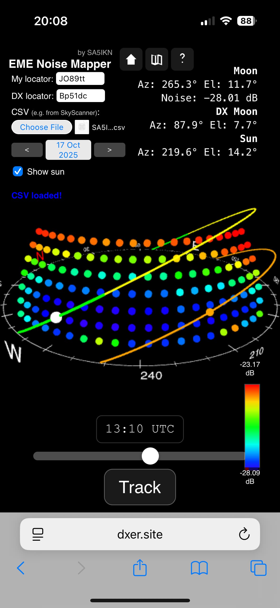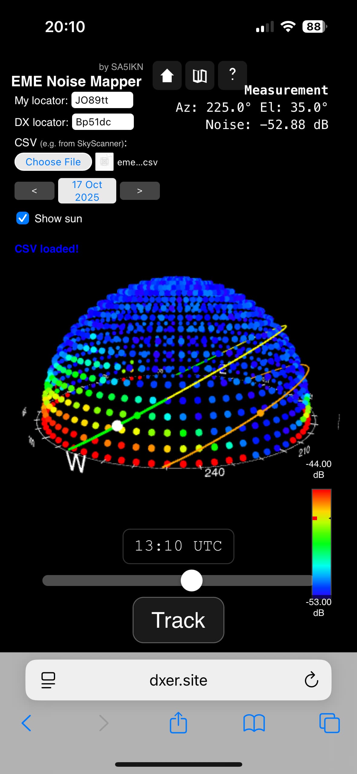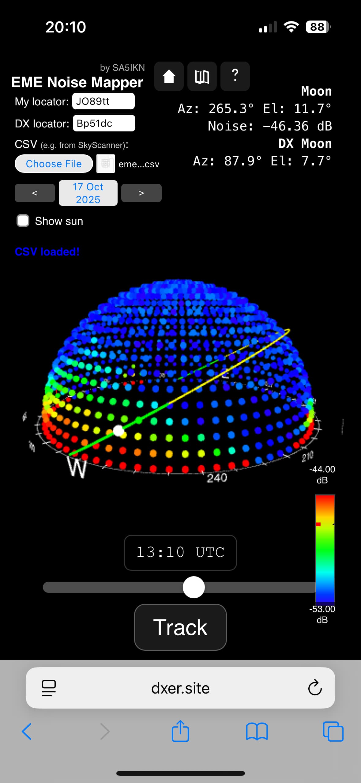EME Noise Mapper includes a real-time tracking mode. Click the Track button to enable continuous updates of the Moon’s position and all associated metrics, including the interpolated noise level.