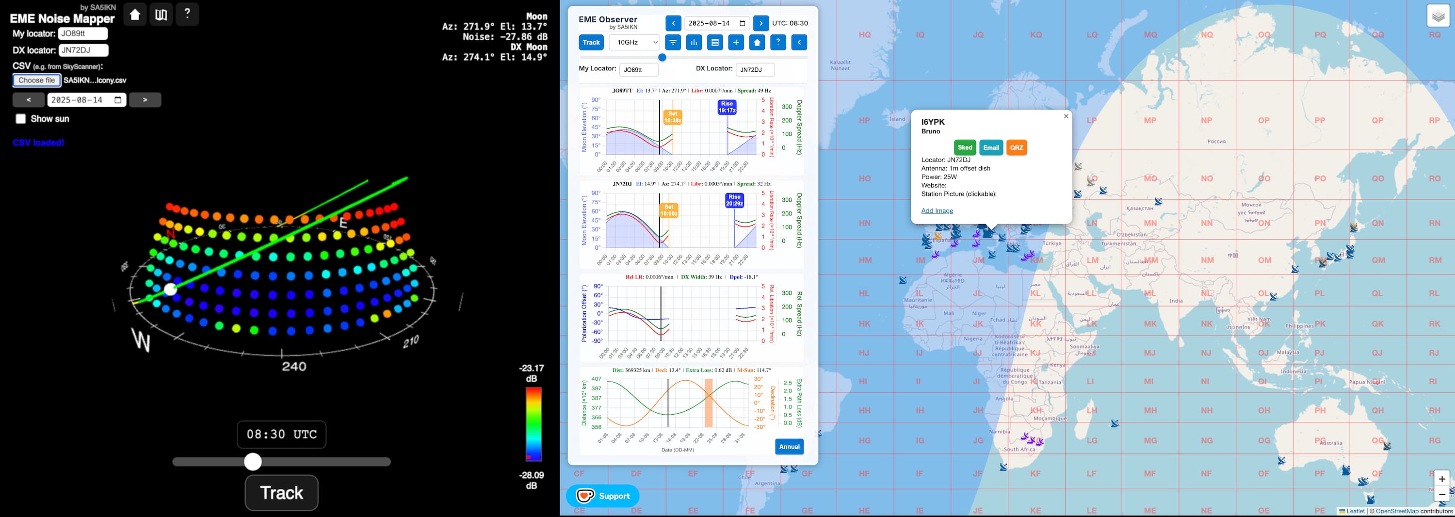 EME Noise Mapper is especially convenient to use alongside EME Observer, a modern interactive EME planner and station map. Used together, the two tools complement each other by combining EME conditions analysis and scheduling insight from EME Observer with site-specific noise and obstruction analysis from EME Noise Mapper. Modern browsers support split-screen or side-by-side viewing, making it easy to use both web applications simultaneously.