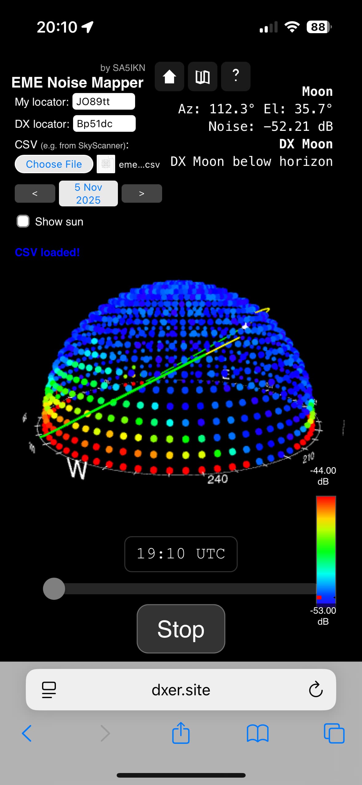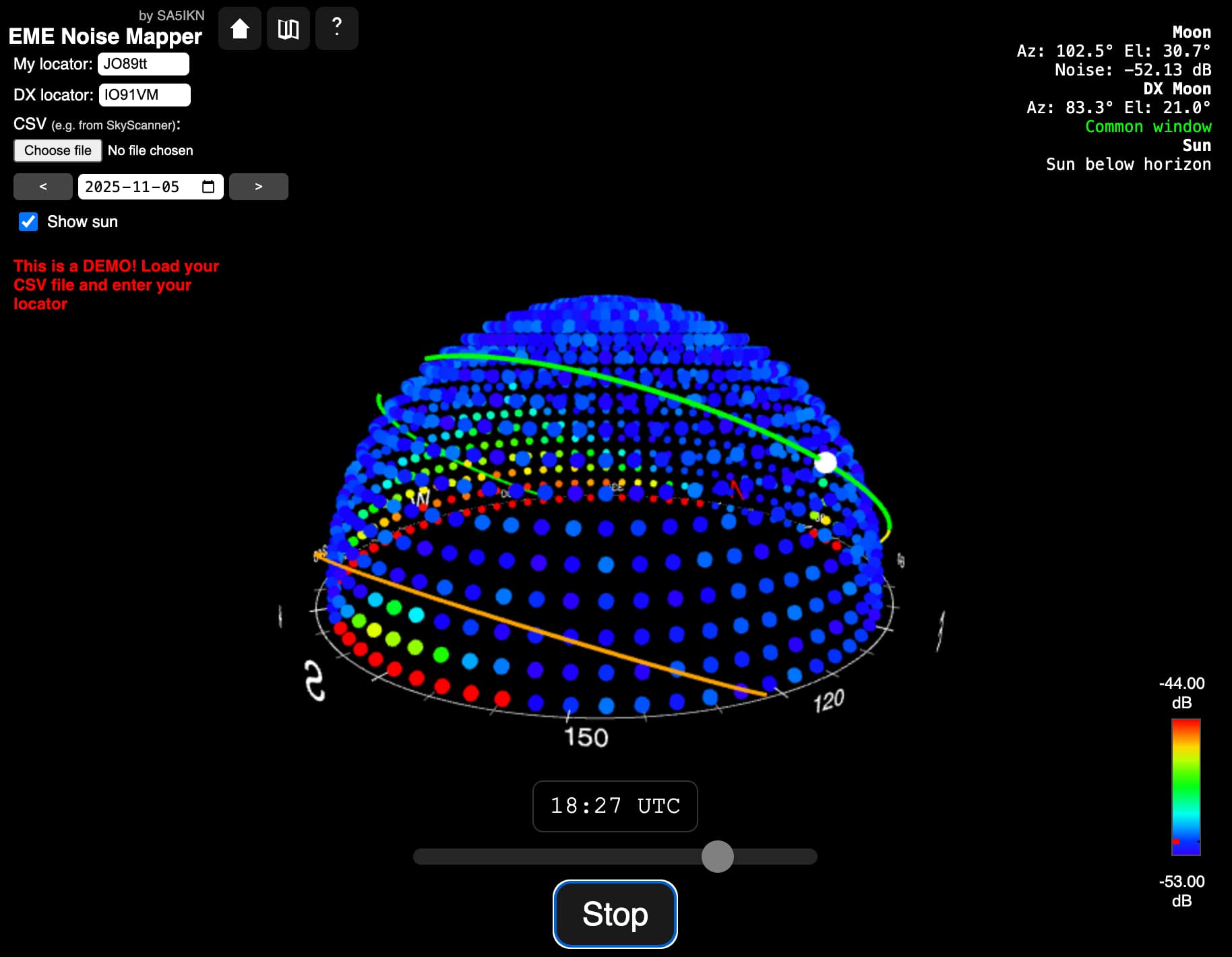 - Interactive 3D noise map: Visualises the sky noise environment as seen from the EME antenna using a 3D dome representation. Users can zoom, pan, rotate, and switch between an external view and an antenna-centred view from inside the dome.