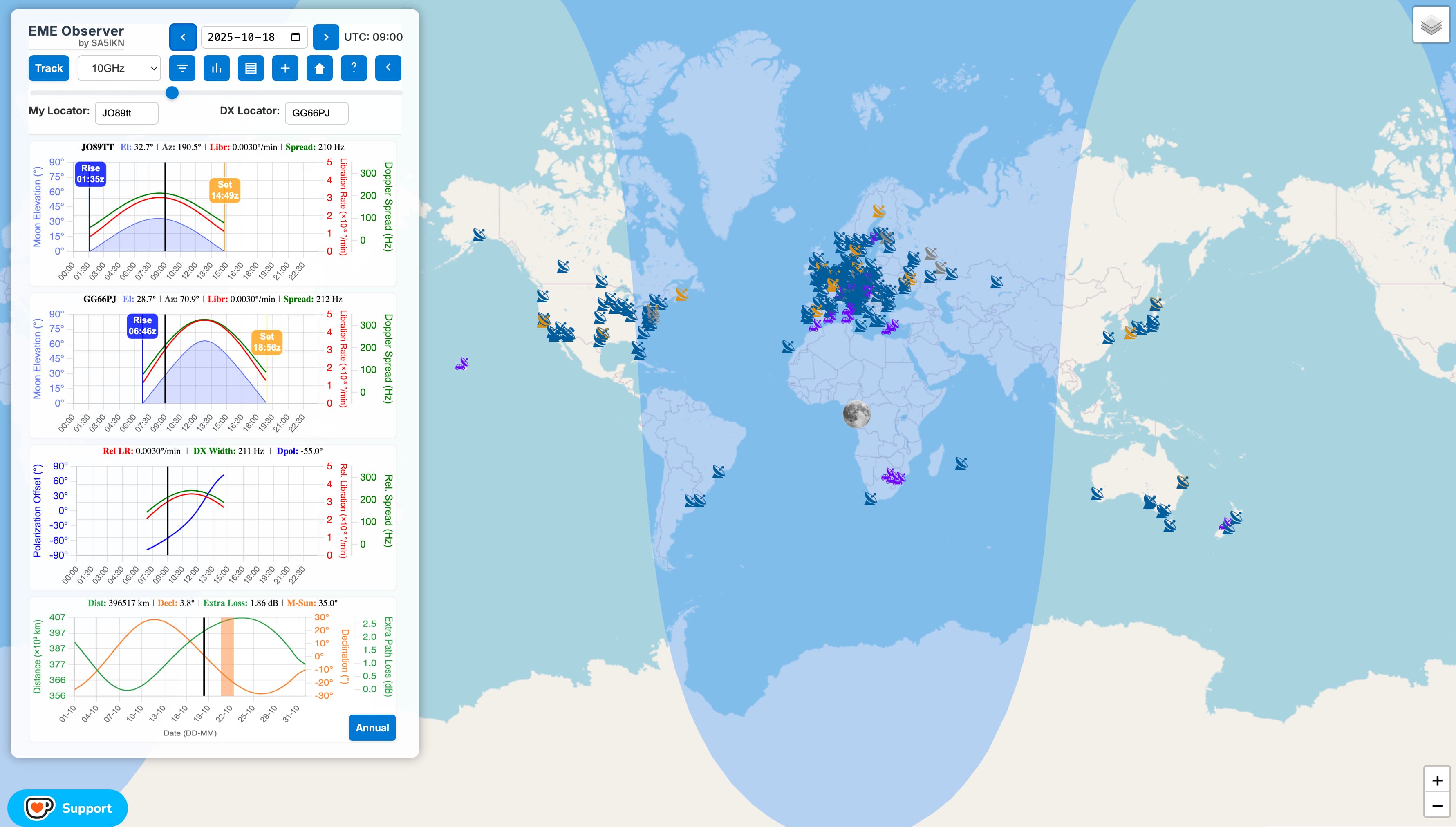 - One-click EME planner for all bands, 432 MHz and above, featuring visualizations of common Moon windows and signal-path characteristics - supports both Manual and Realtime tracking modes (1-minute tracking steps)