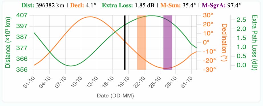 Each curve and its corresponding Y-axis are color-coded, as are the numerical values displayed above the chart for the current Moon distance, declination, and additional path loss. In Manual mode, these values update in 5-minute intervals as you move the time slider, while in Realtime Tracking mode, they automatically update every minute.