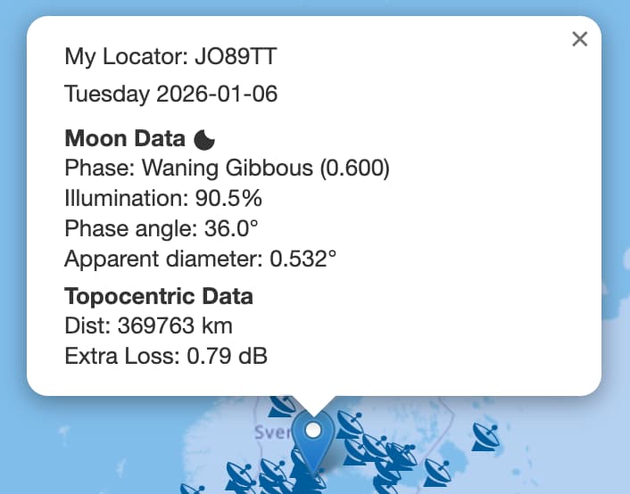 When a valid 6-character QTH locator is entered in the My Locator field, a marker showing your station’s location is displayed on the map. Clicking this marker opens a tooltip containing general lunar data and topocentric (station-specific) moon data, including: